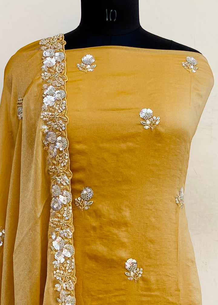 Designer Embroidered Suit Length 3 Piece Beige Tissue With Cutdana & Sequence Work