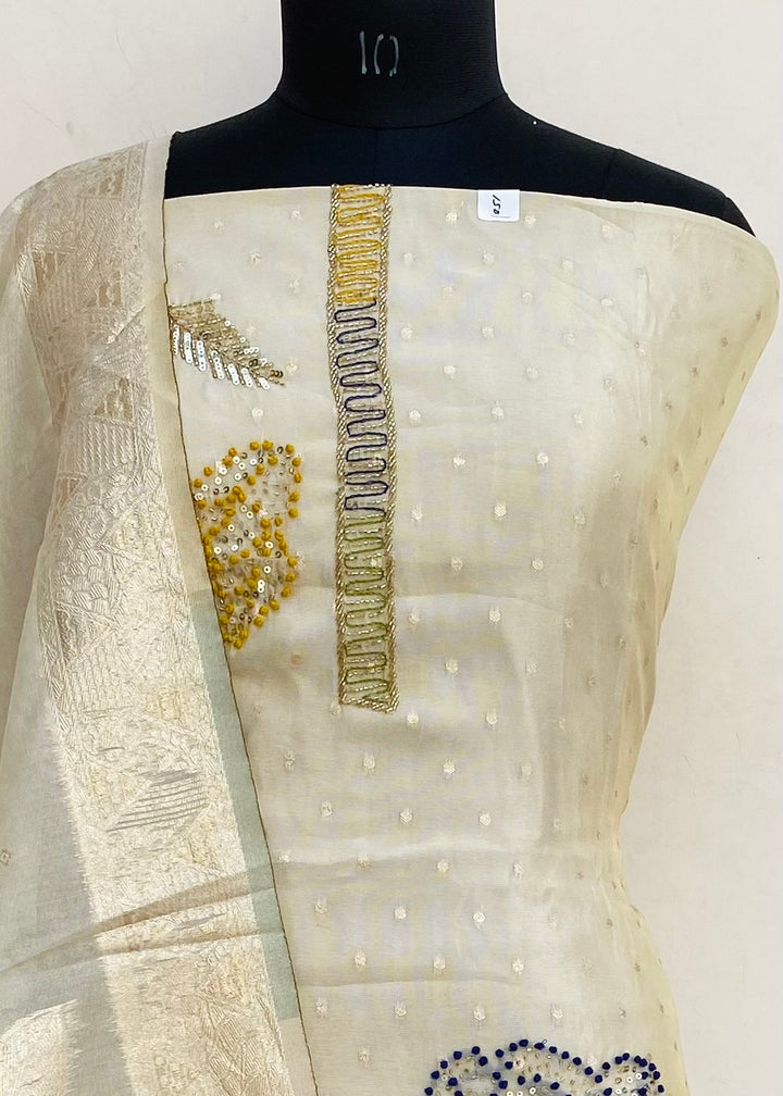 Designer Embroidered Suit Length 3 Piece Beige Tissue With Sequence & Cutdana Work