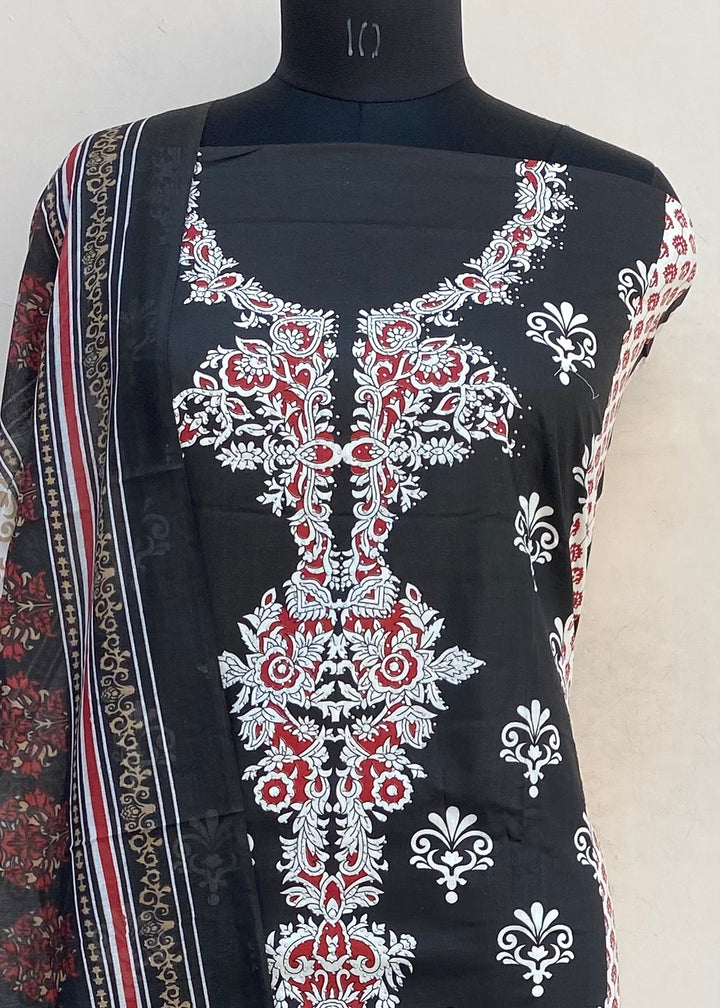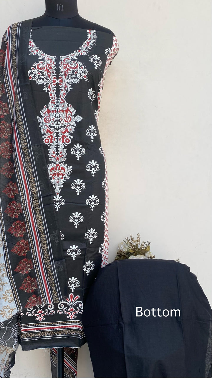 Designer Embroidered Suit Length 3 Piece Black Mal Cotton With Printed Mal Cotton Dupatta & Same Colour Bottom