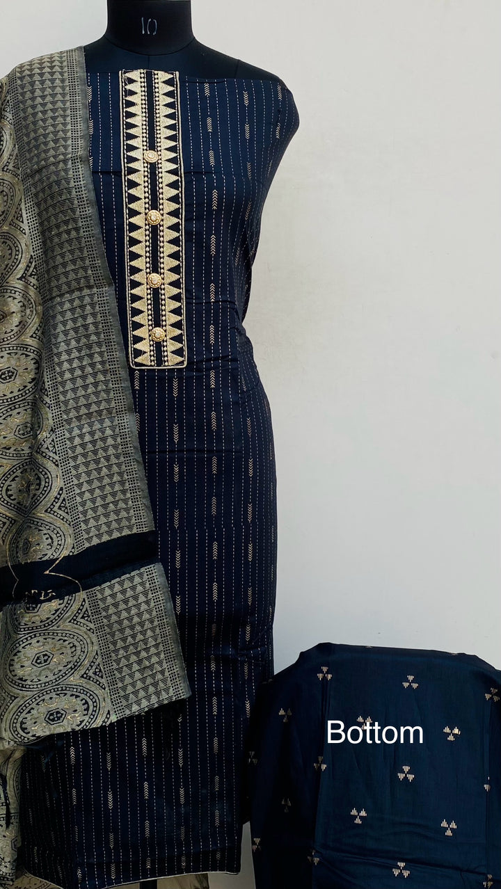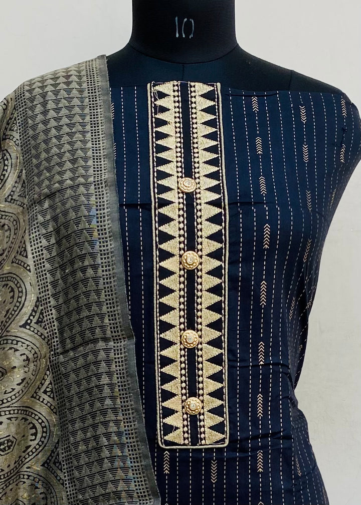 Designer Embroidered Suit Length 3 Piece Black Mal Cotton With Printed Mal Chanderi Dupatta & Printed Same Colour Cotton Bottom