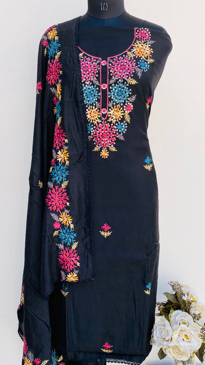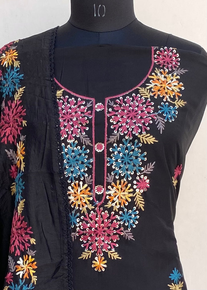 Designer Embroidered Suit Length 3 Piece Black Mal Cotton With Parsi & Sequence Work With Embroidered Mal Chanderi Dupatta & Same Colour Santoon Bottom