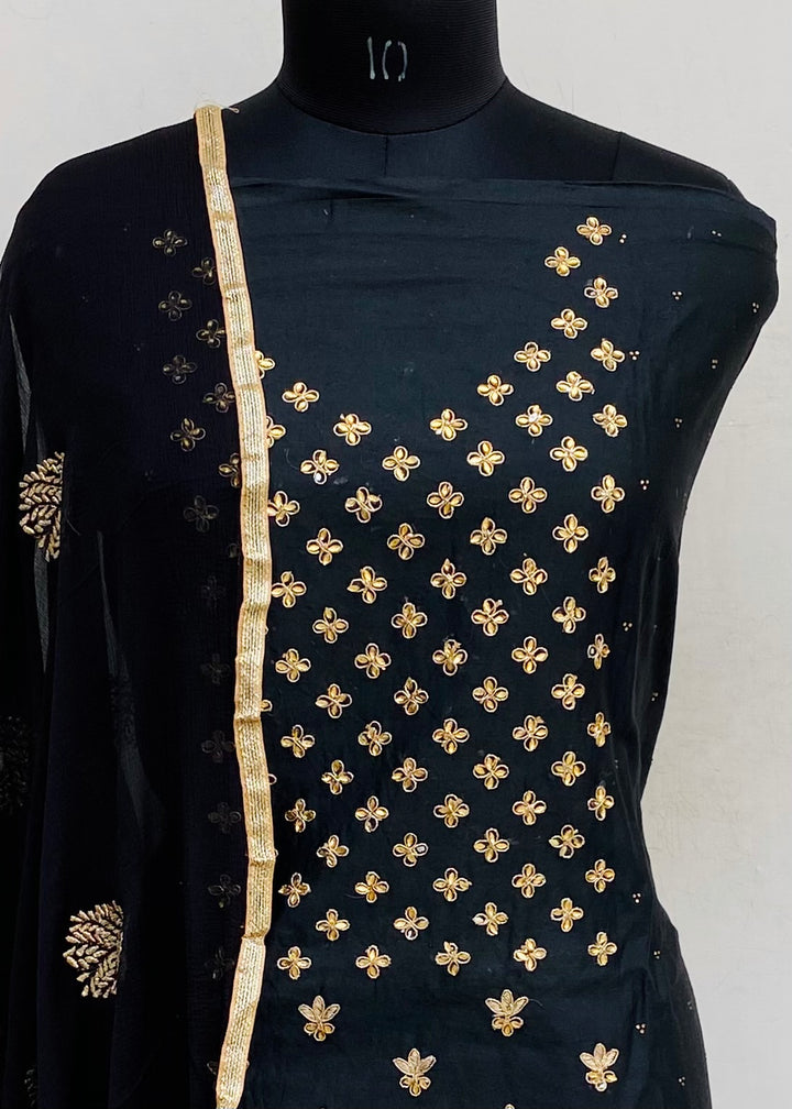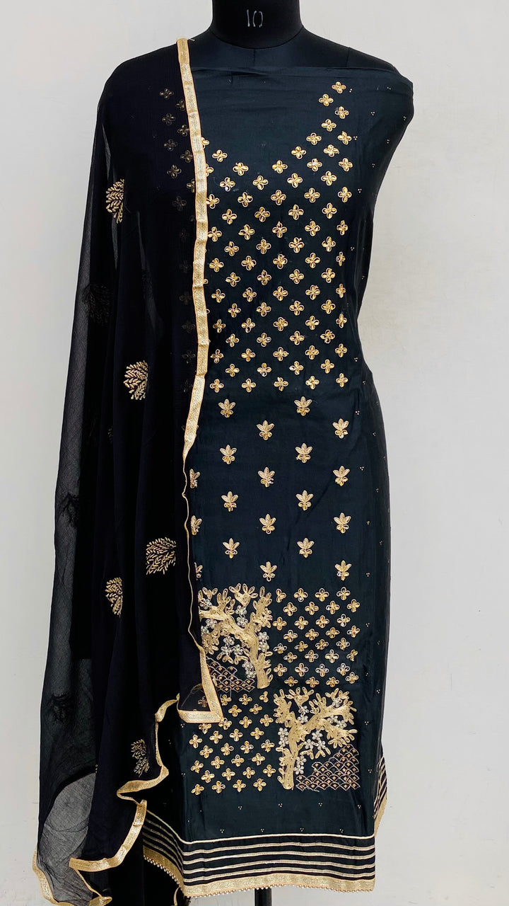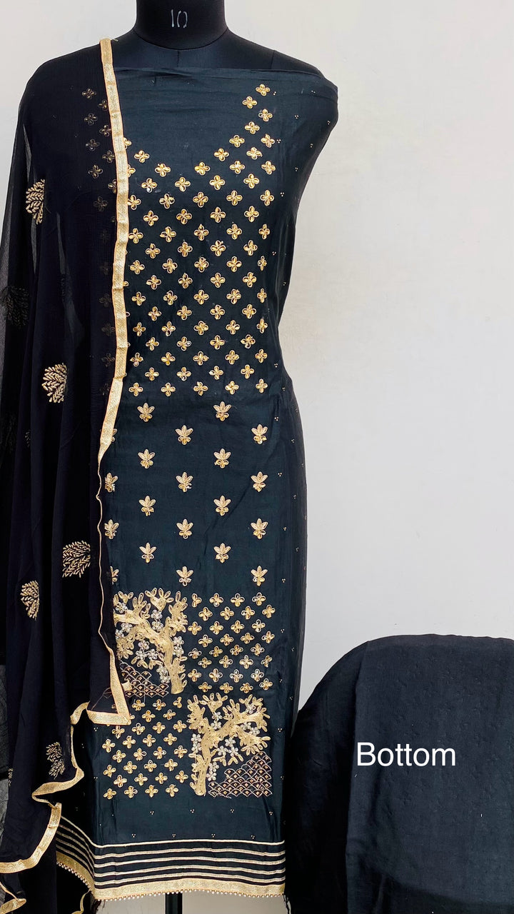 Designer Embroidered Suit Length 3 Piece Black Mal Cotton With Pearl & Stone Work With Embroidered Pure Chiffon Dupatta & Same Colour Cotton Bottom