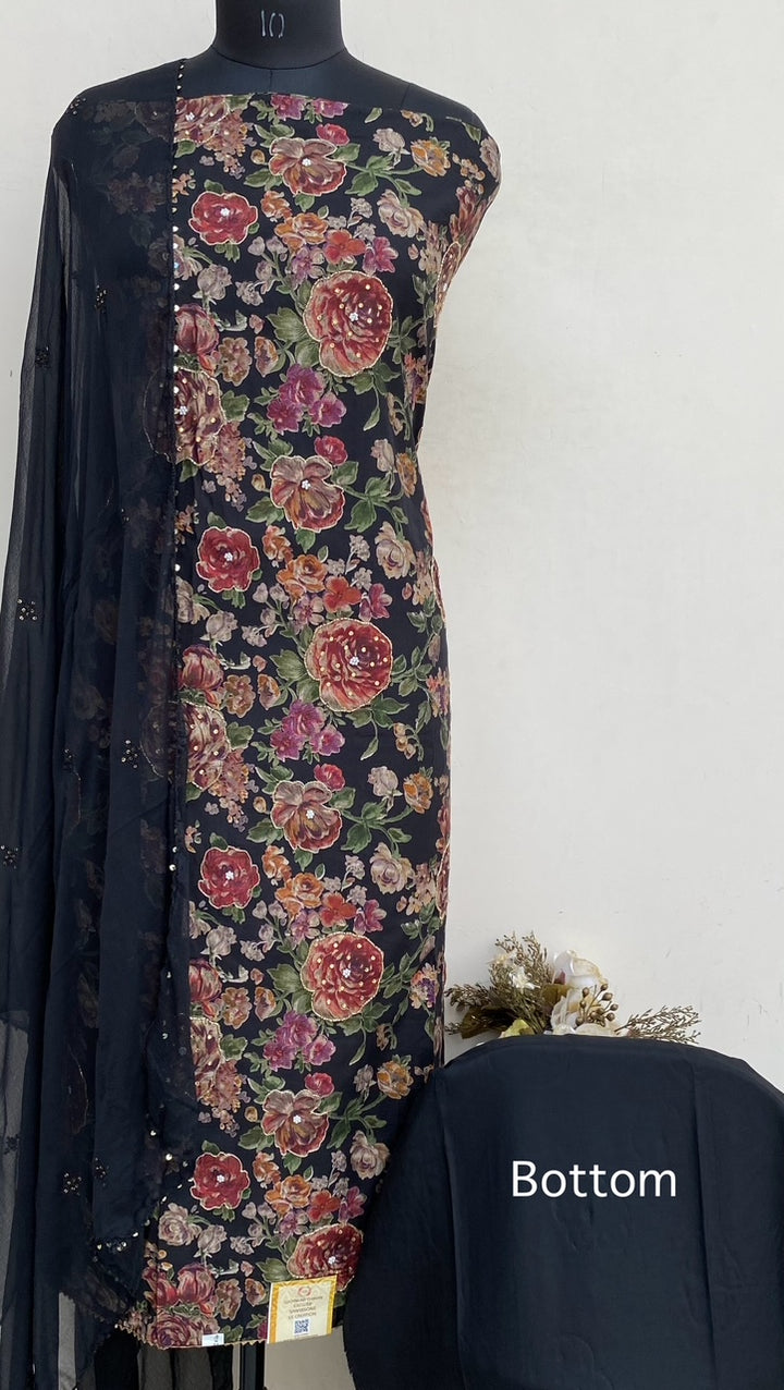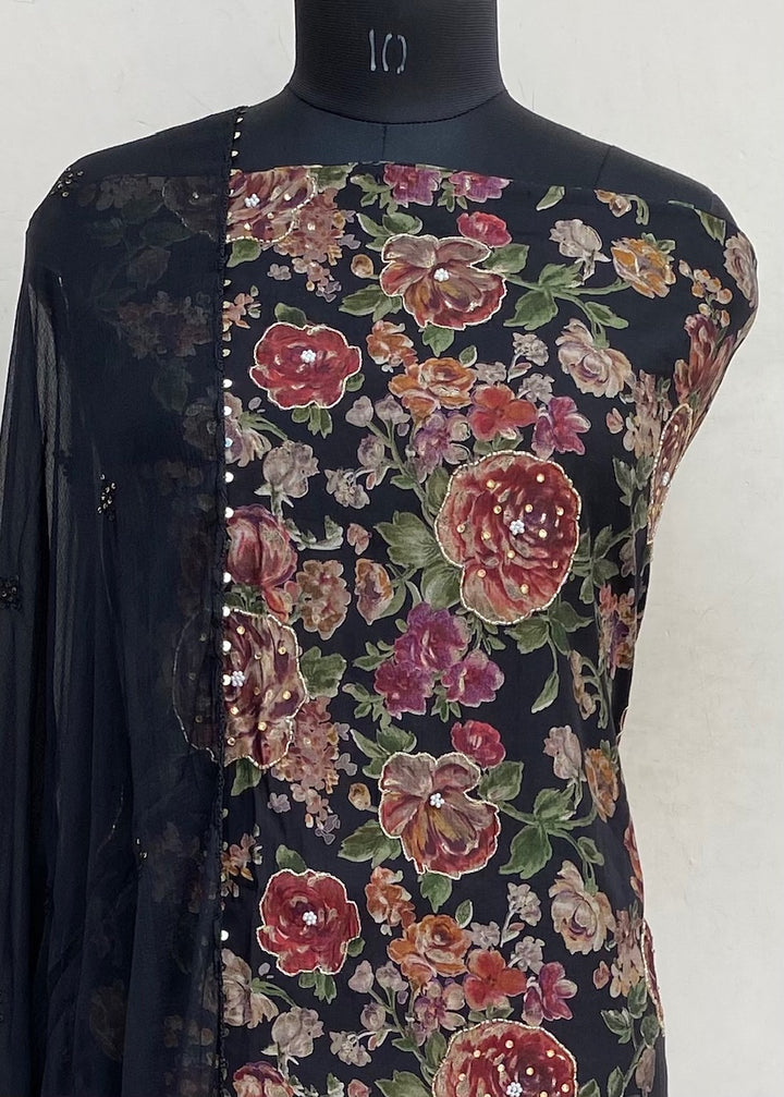 Designer Embroidered Suit Length 3 Piece Black Muslin Cotton With Pearl, Cutdana & Stone Work With Embroidered Pure Chiffon Dupatta & Same Colour Cotton Bottom