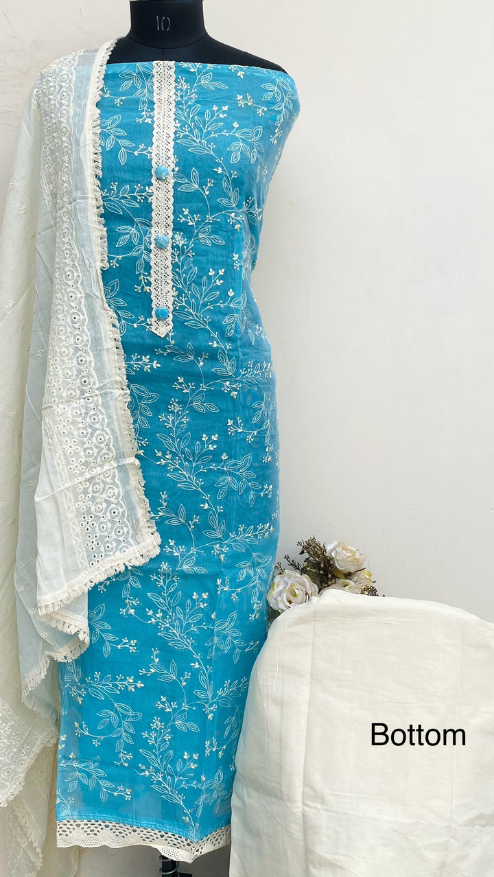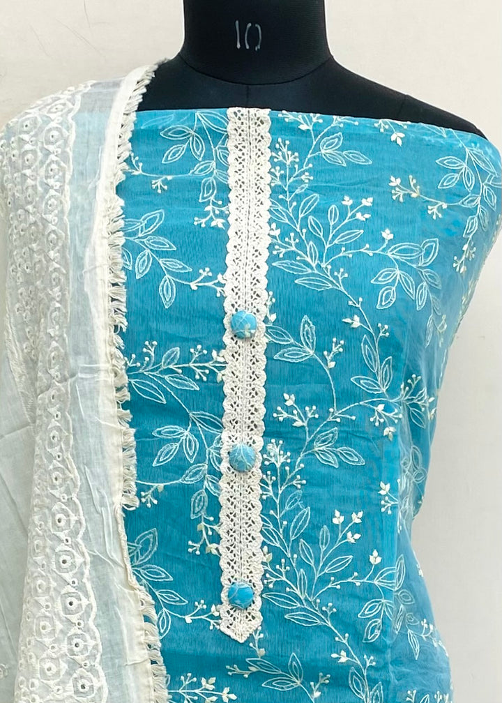 Designer Embroidered Suit Length 3 Piece Blue Kota With Embroidered Mal Cotton Dupatta & Cream Colour Cotton Bottom