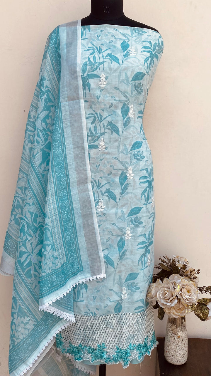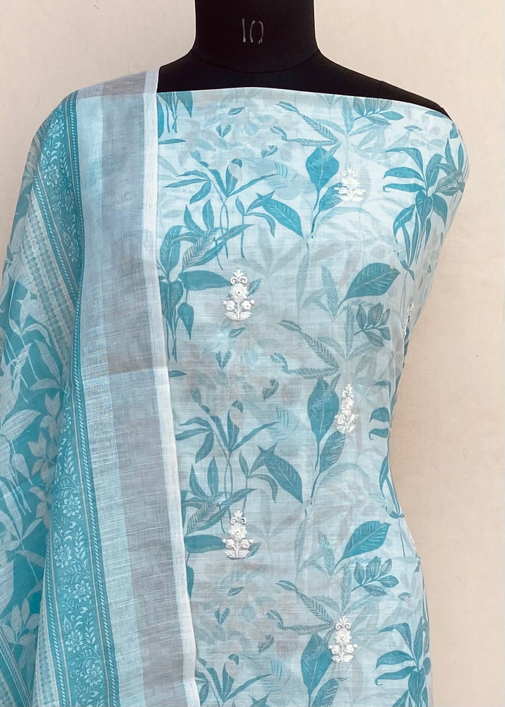 Designer Embroidered Suit Length 3 Piece Blue Linen With Printed Linen Dupatta & Same Colour Cotton Bottom