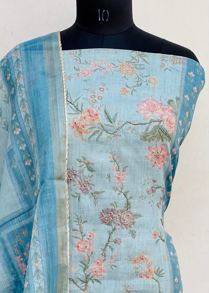 Designer Embroidered Suit Length 3 Piece Blue Linen With Cutdana & Pearl Work With Printed Linen Dupatta & Same Colour Cotton Bottom