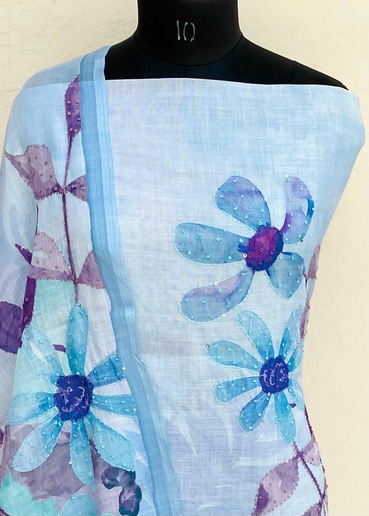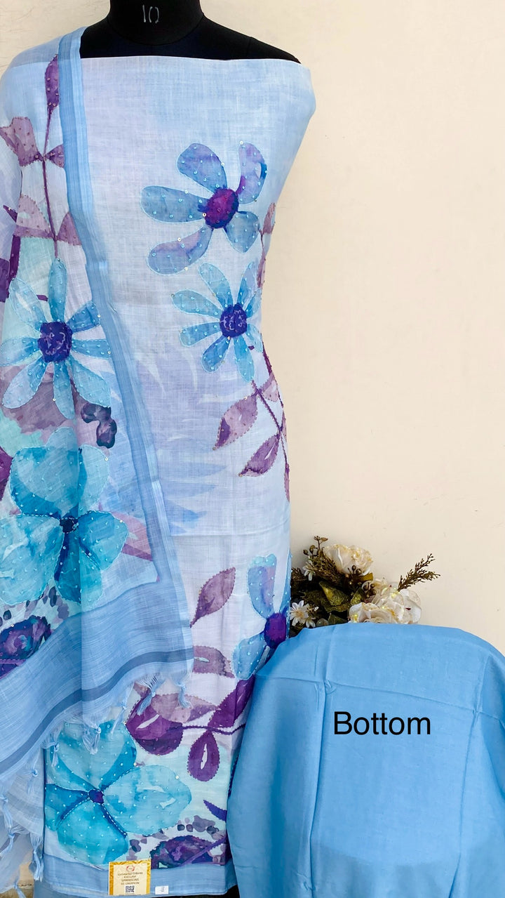 Designer Embroidered Suit Length 3 Piece Blue Linen With Sequence Work With Printed Linen Dupatta & Same Colour Cotton Bottom