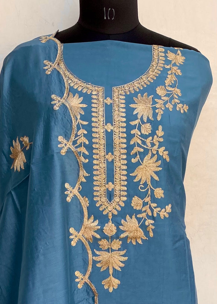 Designer Embroidered Suit Length 3 Piece Blue Mal Chanderi