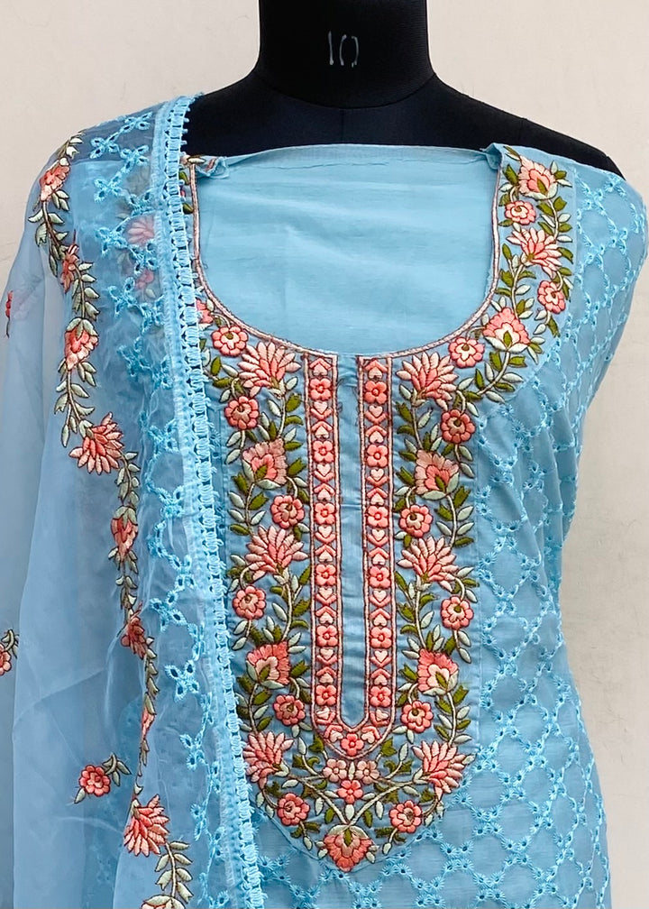 Designer Embroidered Suit Length 3 Piece Blue Mal Chanderi With Embroidered Organza Dupatta & Same Colour Cotton Bottom