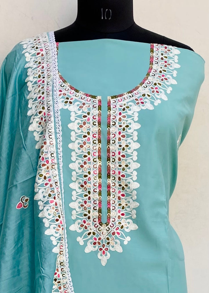 Designer Embroidered Suit Length 3 Piece Blue Mal Chanderi With Embroidered Mal Chanderi Dupatta & Same Colour Santoon Bottom