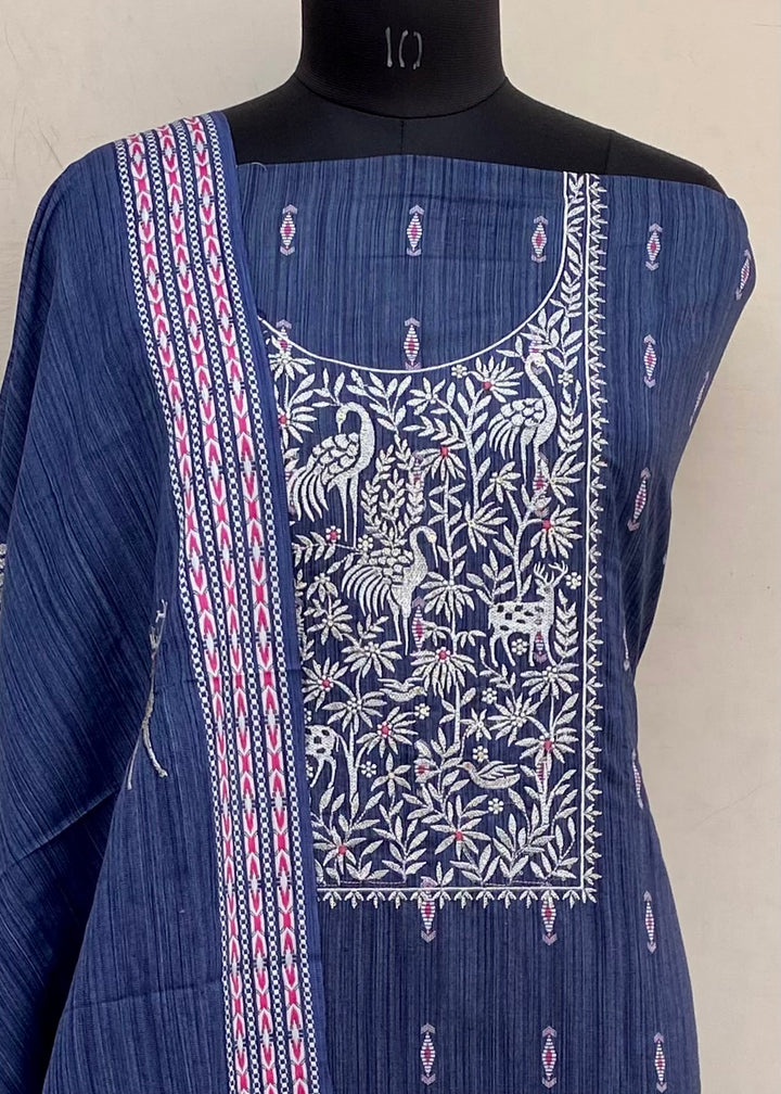 Designer Embroidered Suit Length 3 Piece Blue Mal Cotton With Sequence Work