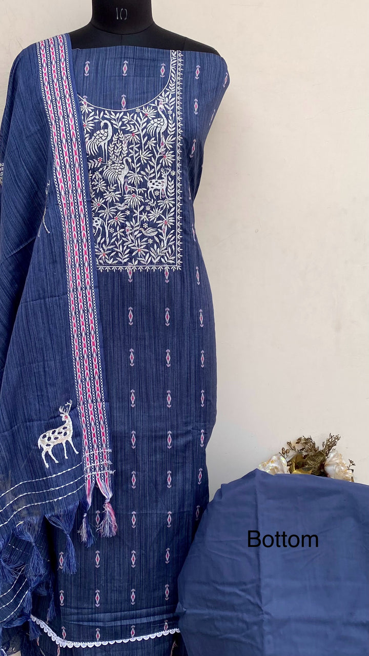 Designer Embroidered Suit Length 3 Piece Blue Mal Cotton With Sequence Work With Embroidered Mal Cotton Dupatta & Same Colour Cotton Bottom