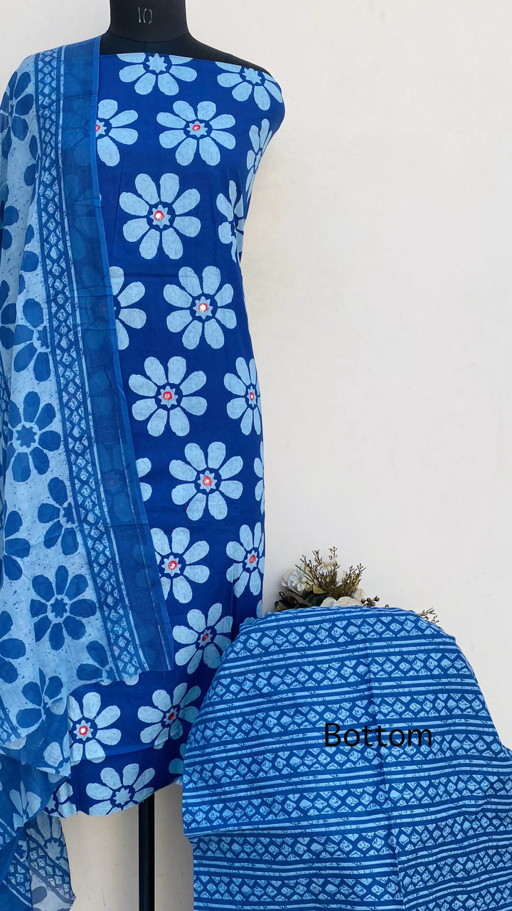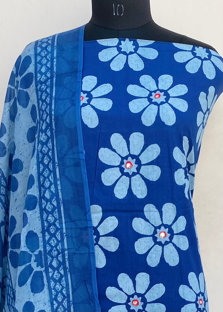 Designer Embroidered Suit Length 3 Piece Blue Mal Cotton With Printed Mal Cotton Dupatta & Printed Same Colour Cotton Bottom