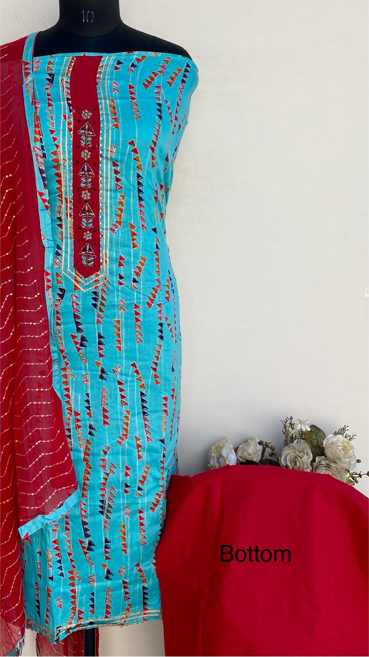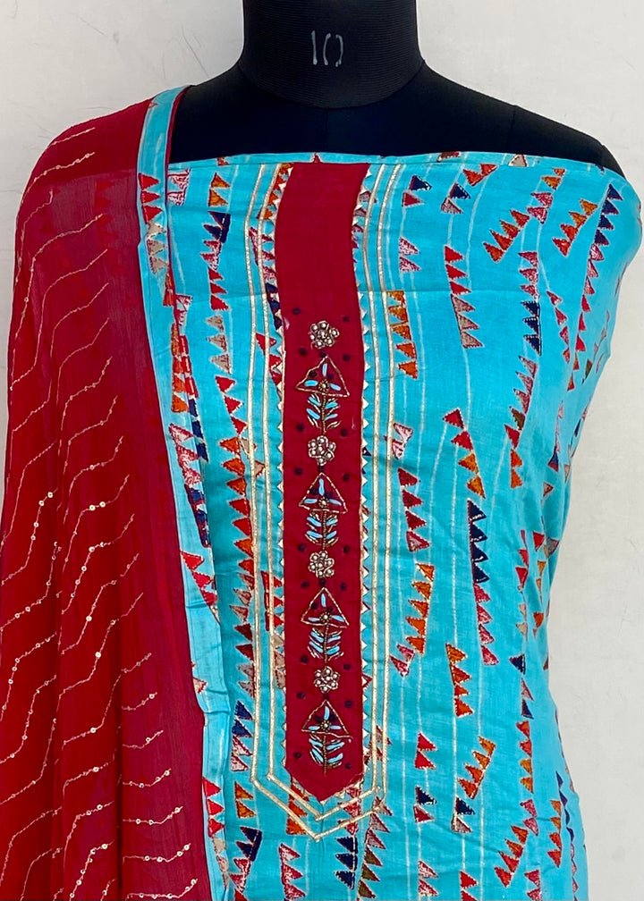 Designer Embroidered Suit Length 3 Piece Blue Muslin Cotton With Cutdana Work With Embroidered Pure Chiffon Dupatta & Red Colour Cotton Bottom
