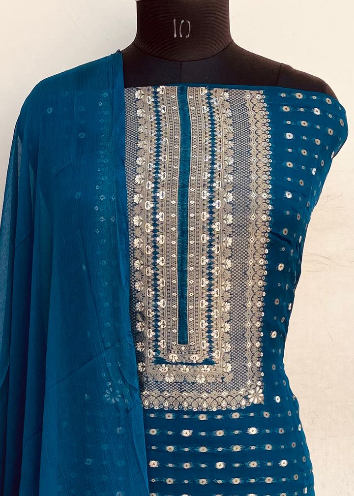 Designer Embroidered Suit Length 3 Piece Blue Organza