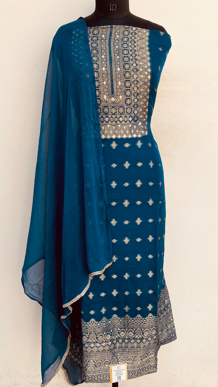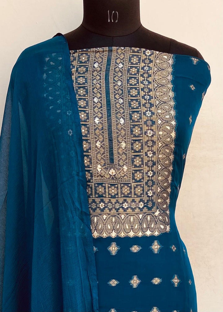 Designer Embroidered Suit Length 3 Piece Blue Organza With Pure Chiffon Dupatta & Same Colour Cotton Bottom