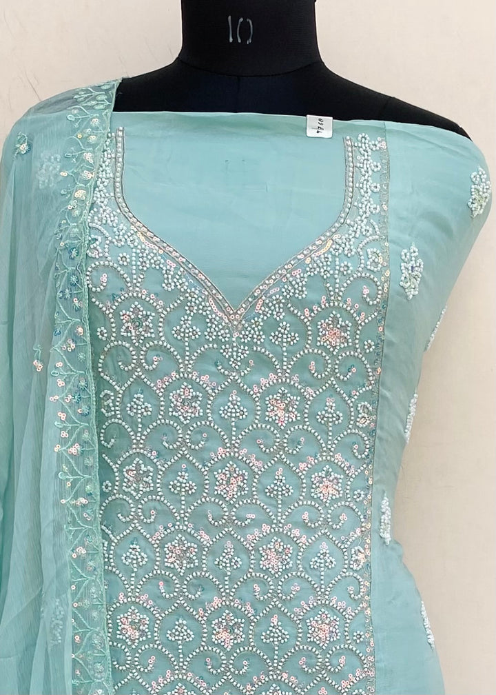 Designer Embroidered Suit Length 3 Piece Blue Organza With Cutdana & Sequence Work