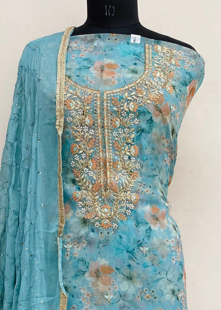 Designer Embroidered Suit Length 3 Piece Blue Organza With Pearl ,Cutdana & Sequence Work With Embroidered Pure Chiffon Dupatta & Same Colour Cotton Bottom