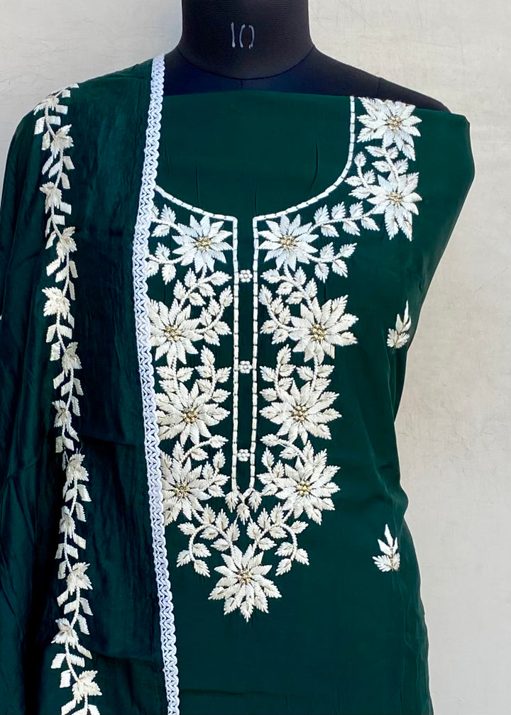 Designer Embroidered Suit Length 3 Piece Bottle Green Mal Chanderi
