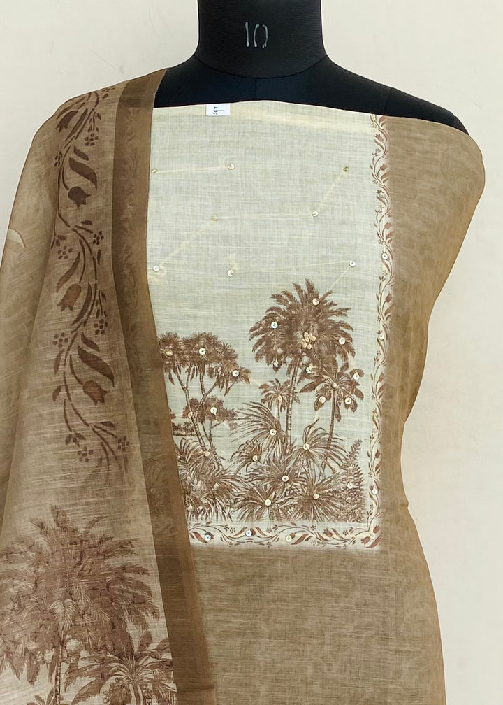 Designer Embroidered Suit Length 3 Piece Brown Linen With Sequence Work With Printed Linen Dupatta & Same Colour Cotton Bottom