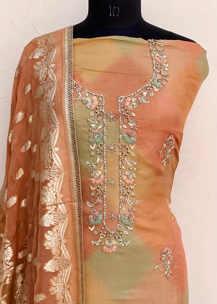 Designer Embroidered Suit Length 3 Piece Brown Mal Chanderi With Pearl & Sequence Work
