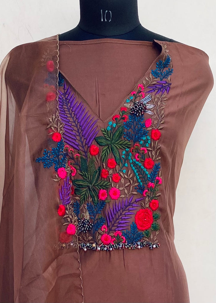 Designer Embroidered Suit Length 3 Piece Brown Mal Chanderi With Pearl Work With Embroidered Organza Dupatta & Same Colour Cotton Bottom