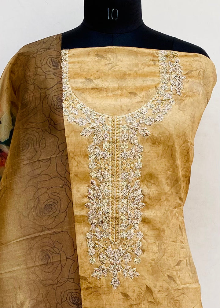 Designer Embroidered Suit Length 3 Piece Brown Mal Chanderi With Sequence Work