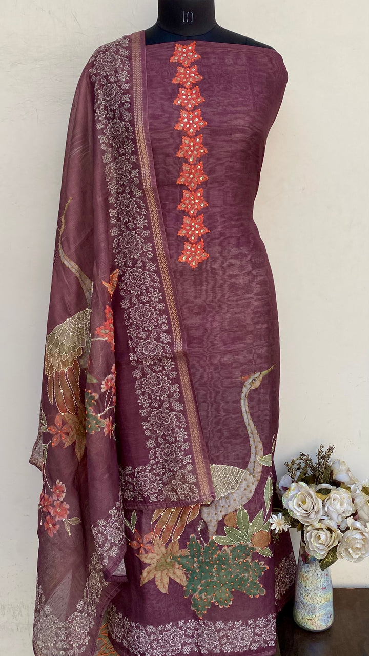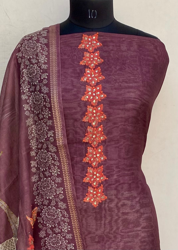 Designer Embroidered Suit Length 3 Piece Brown Mal Chanderi With Sequence Work With Embroidered Mal Chanderi Dupatta & Same Colour Cotton Bottom