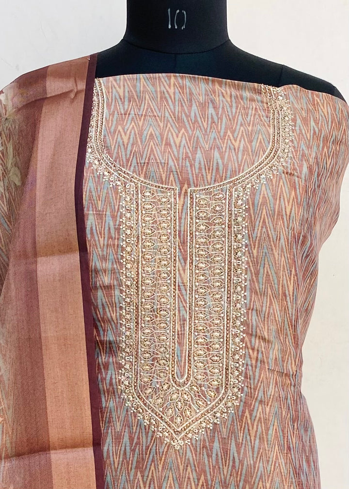 Designer Embroidered Suit Length 3 Piece Brown Mal Chanderi With Stone Work