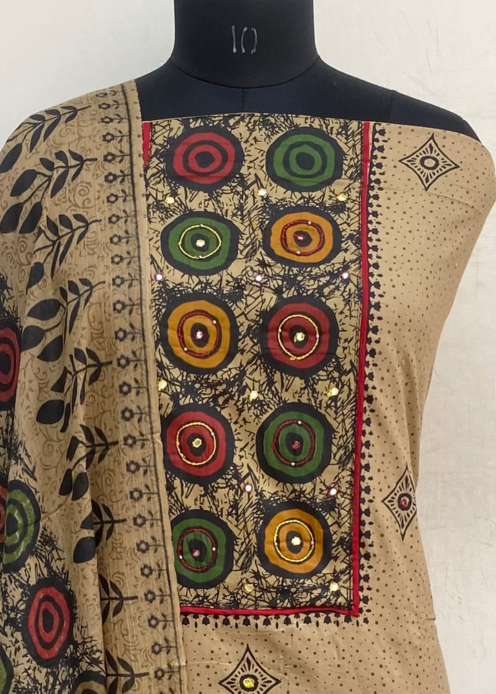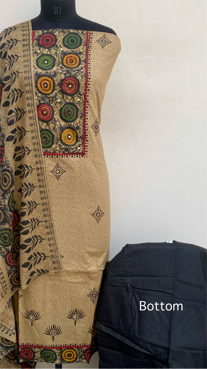 Designer Embroidered Suit Length 3 Piece Brown Mal Cotton With Printed Mal Cotton Dupatta & Black Colour Cotton Bottom