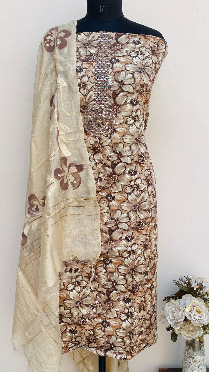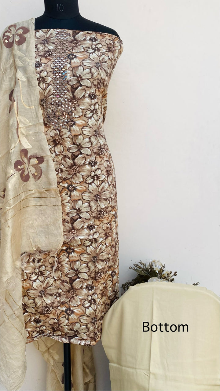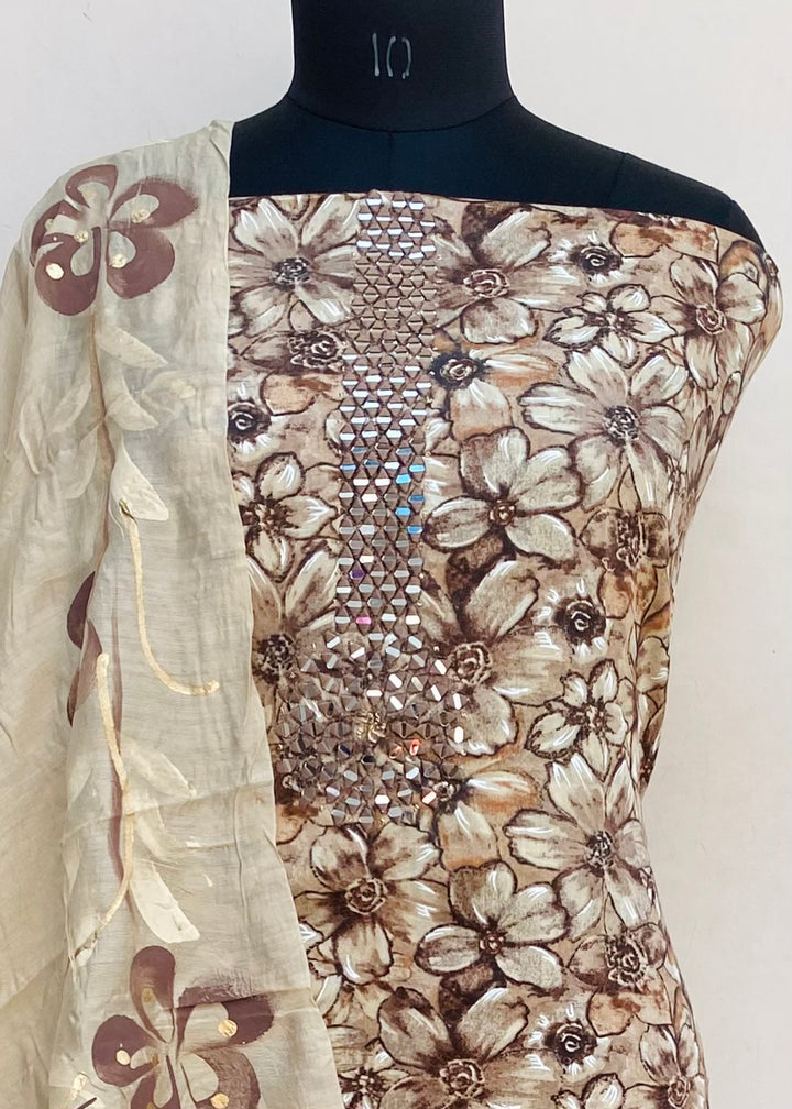 Designer Embroidered Suit Length 3 Piece Brown Mal Cotton With Mirror Work With Printed Mal Chanderi Dupatta & Beige Colour Cotton Bottom