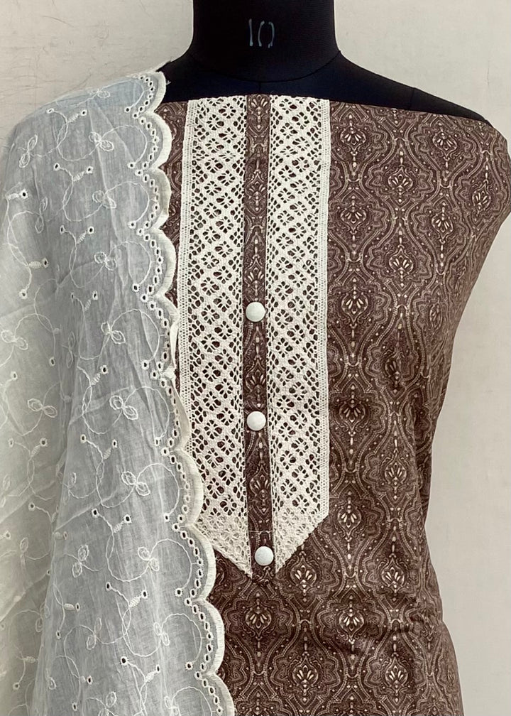 Designer Embroidered Suit Length 3 Piece Brown Muslin Cotton