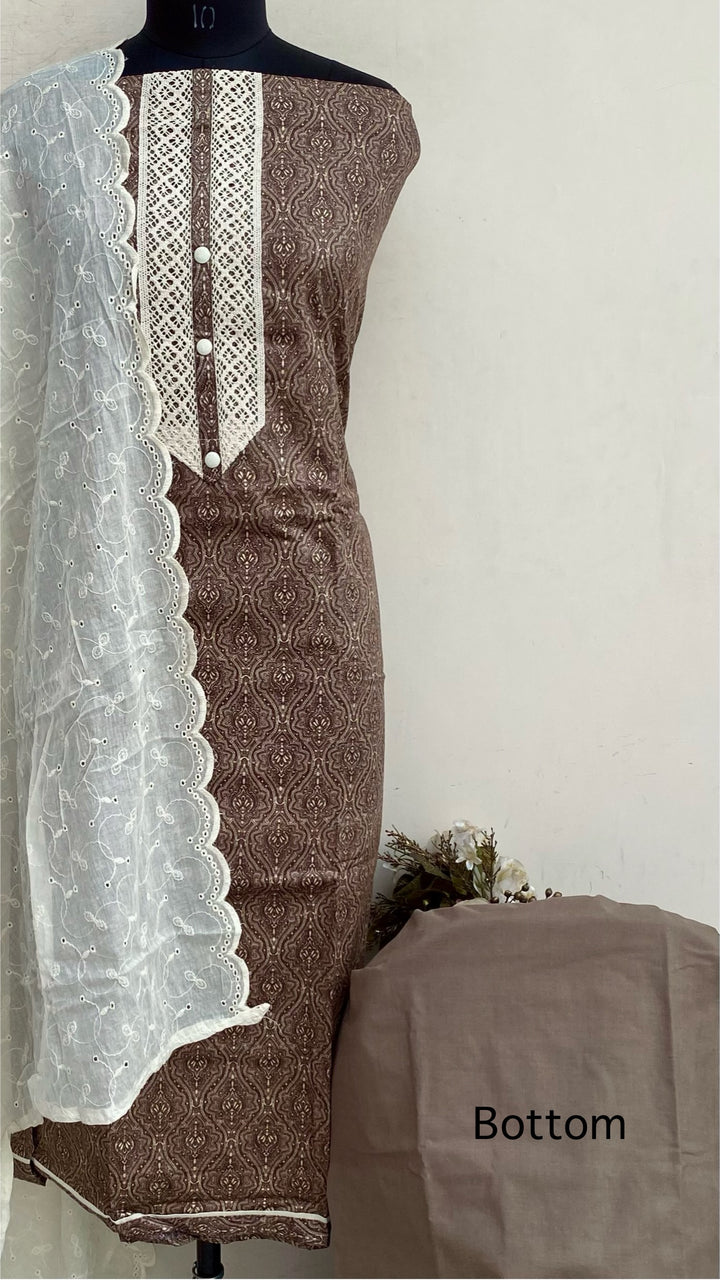 Designer Embroidered Suit Length 3 Piece Brown Muslin Cotton With Embroidered Mal Cotton Dupatta & Same Colour Cotton Bottom