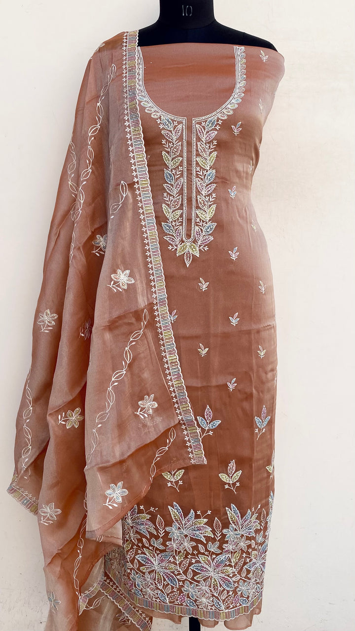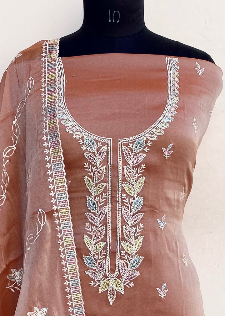 Designer Embroidered Suit Length 3 Piece Brown Tissue With Stone Work With Embroidered Tissue Dupatta & Same Colour Cotton Bottom