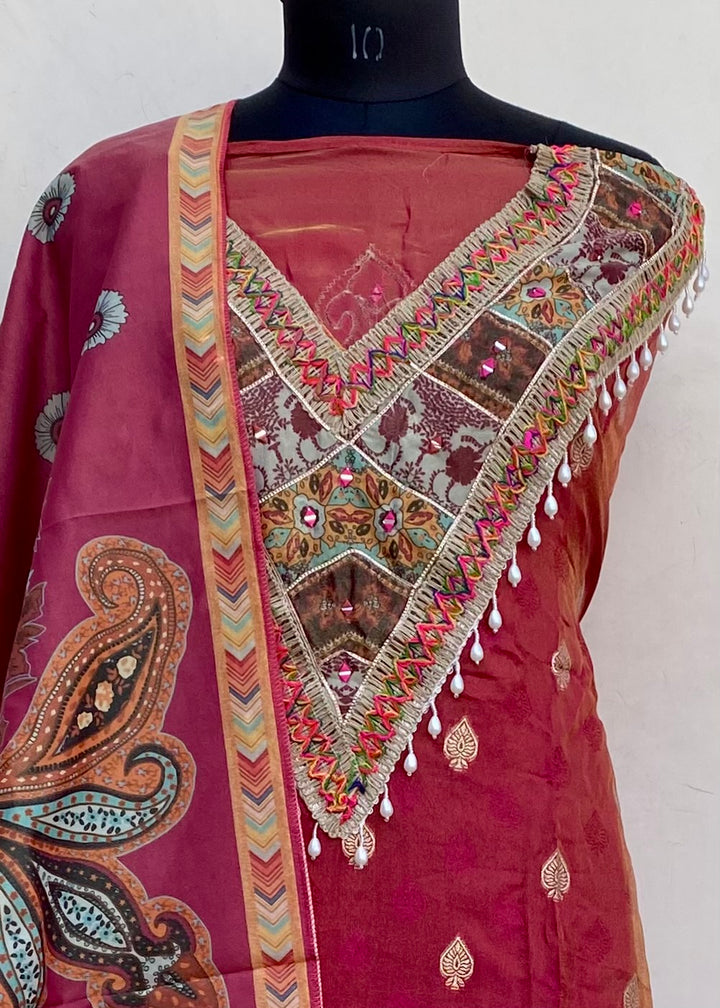 Designer Embroidered Suit Length 3 Piece Copper Mal Chanderi With Mirror & Pearl Work With Printed Mal Chanderi Dupatta & Same Colour Cotton Bottom