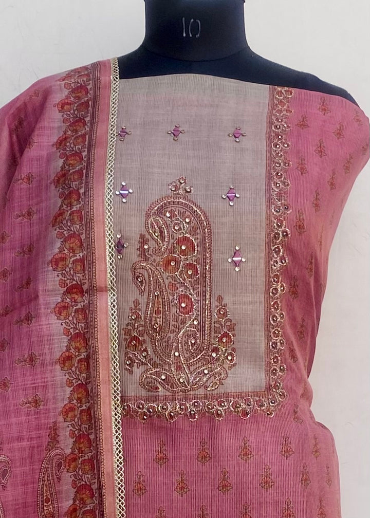 Designer Embroidered Suit Length 3 Piece Copper Mal Chanderi With Stone & Mirror Work With Printed Mal Chanderi Dupatta & Same Santoon Cotton Bottom
