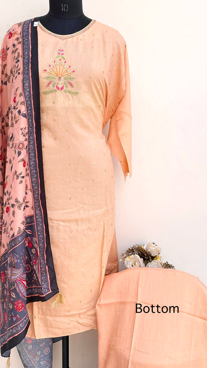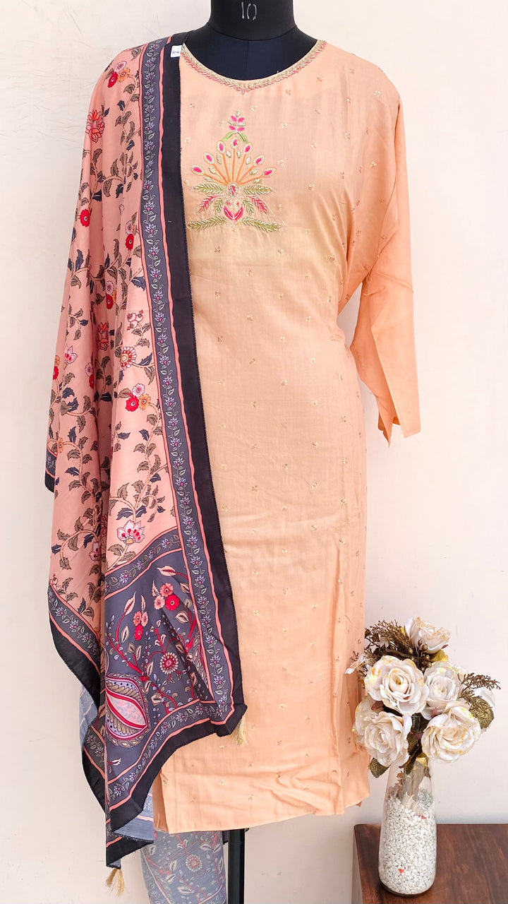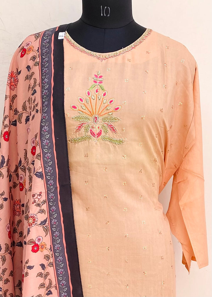 Designer Embroidered Suit Length 3 Piece Peach Muslin Cotton With Sequence Work With Printed Muslin Dupatta & Same Colour Cotton Bottom