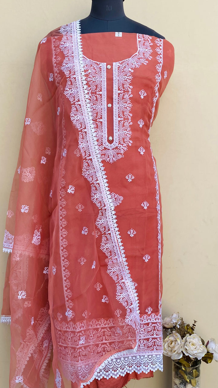 Designer Embroidered Suit Length 3 Piece Copper Organza With Embroidered Organza Dupatta & Same Colour Cotton Bottom