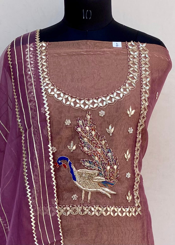 Designer Embroidered Suit Length 3 Piece Copper Tissue With Pearl & Gotta Patti Work With Embroidered Organza Dupatta & Same Colour Santoon Bottom