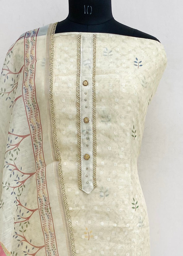 Designer Embroidered Suit Length 3 Piece Cream Linen With Stone Work With Printed Linen Dupatta & Same Colour Cotton Bottom