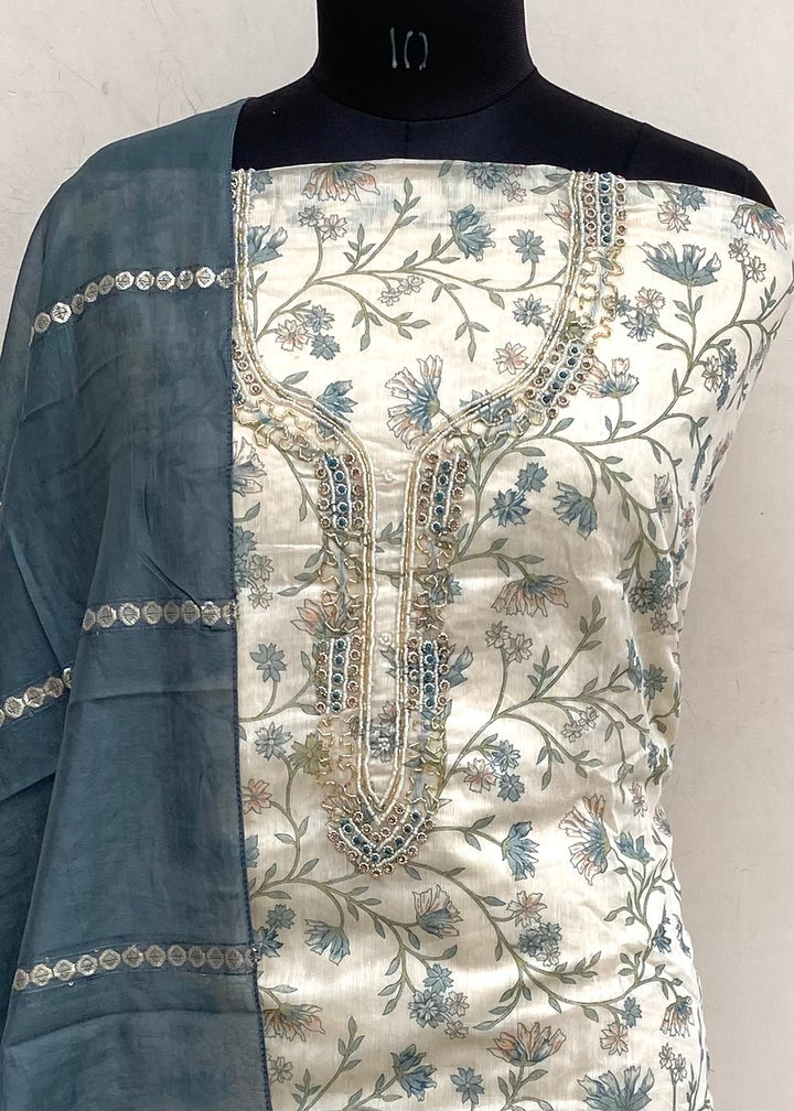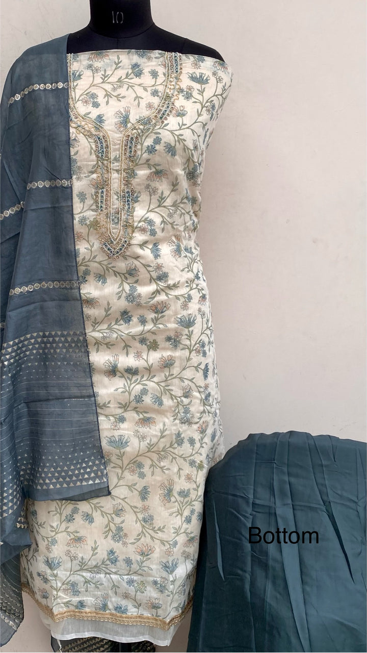 Designer Embroidered Suit Length 3 Piece Cream Mal Chanderi With Pearl & Cutdana Work With Embroidered Mal Chanderi Dupatta & Gray Colour Santoon Bottom