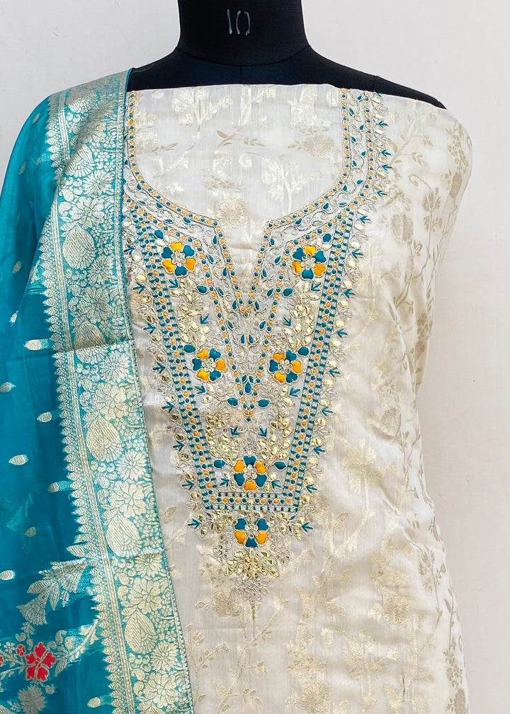 Designer Embroidered Suit Length 3 Piece Cream Mal Chanderi With Sequence Work With Embroidered Mal Chanderi Dupatta & Same Colour Santoon Bottom