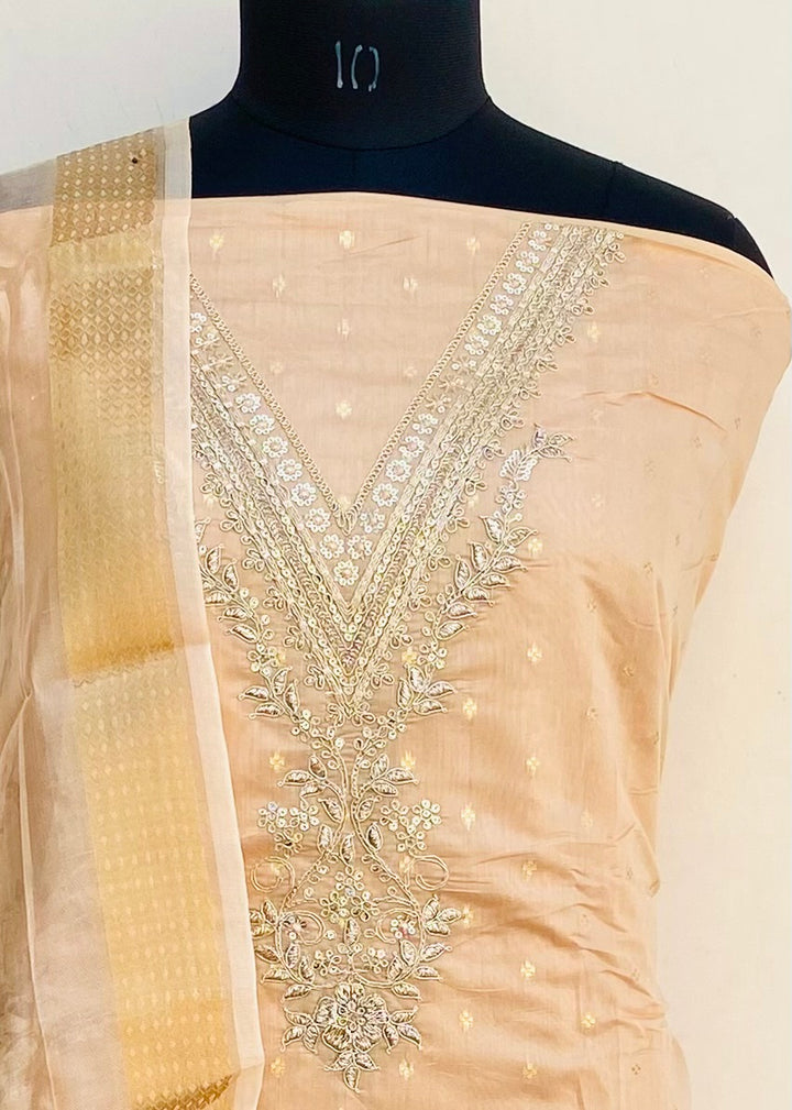 Designer Embroidered Suit Length 3 Piece Cream Mal Chanderi With Sequence Work With Printed Mal Chanderi Dupatta & Same Colour Santoon Bottom