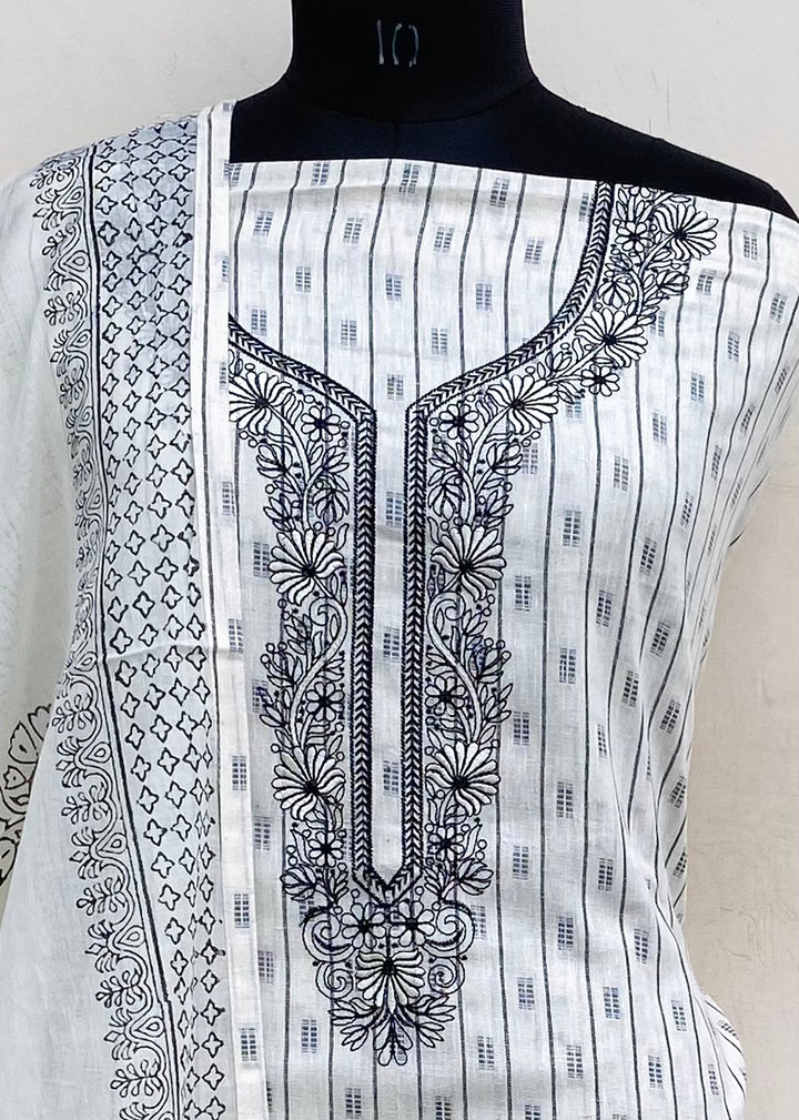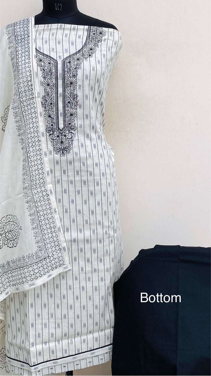 Designer Embroidered Suit Length 3 Piece Cream Mal Cotton With Printed Mal Cotton Dupatta & Black Colour Cotton Bottom