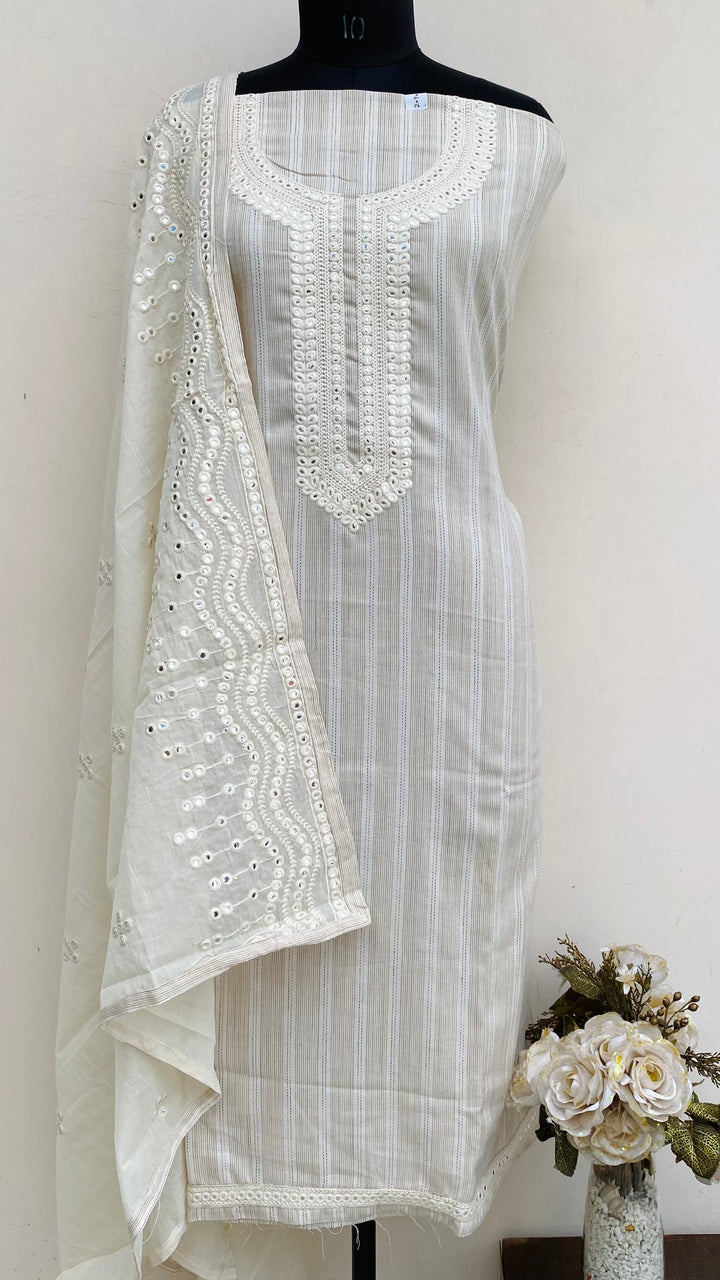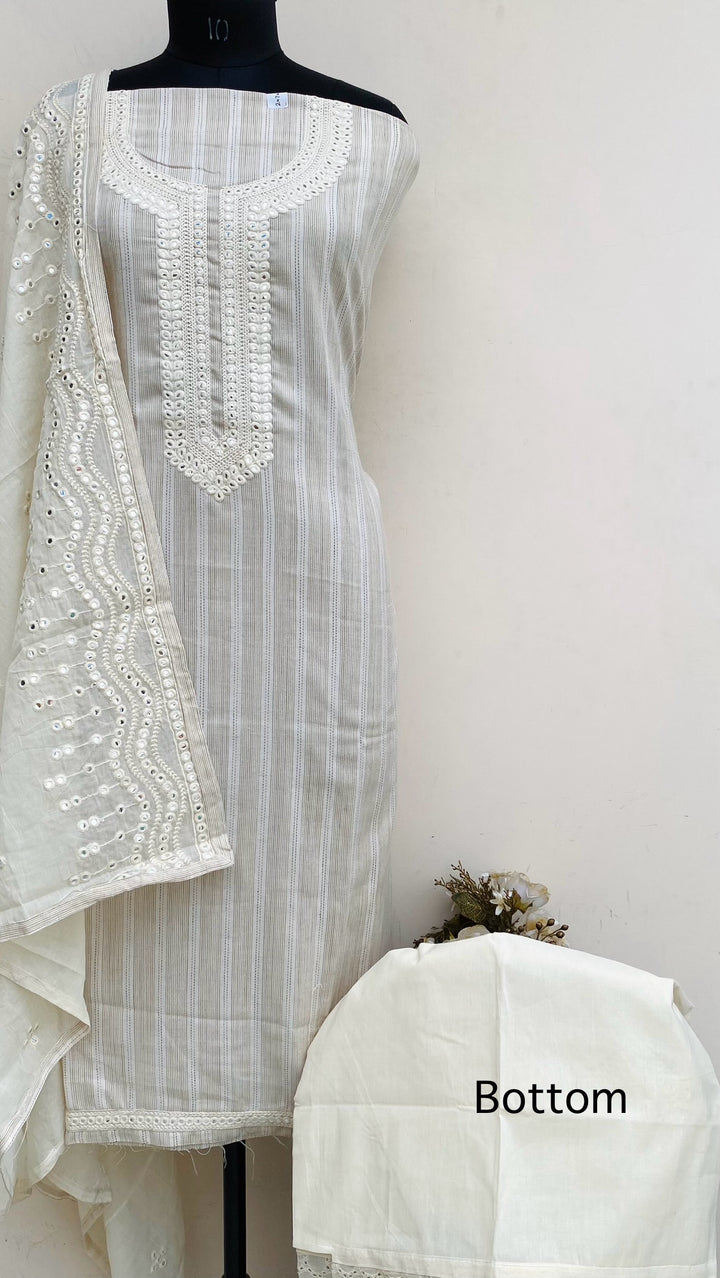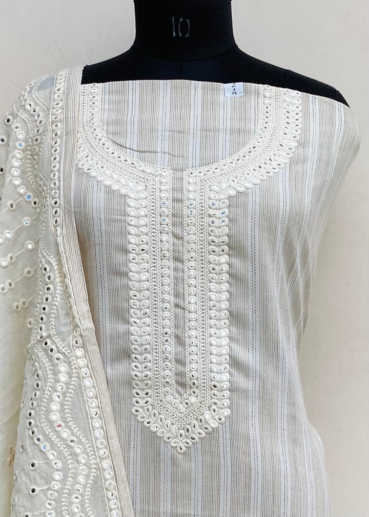 Designer Embroidered Suit Length 3 Piece Cream Mal Cotton With Embroidered Mal Cotton Dupatta & Same Colour Cotton Bottom
