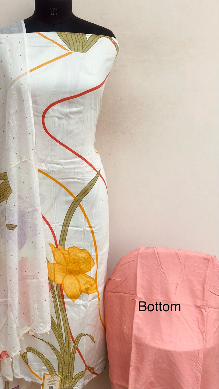 Designer Embroidered Suit Length 3 Piece Cream Mal Cotton With Printed Mal Cotton Dupatta & Pink Colour Cotton Bottom