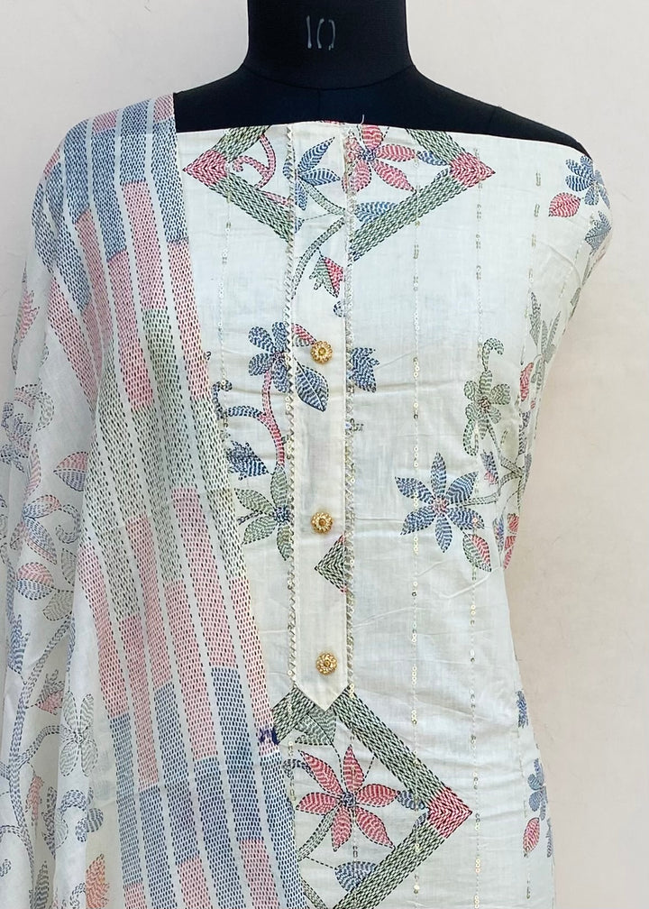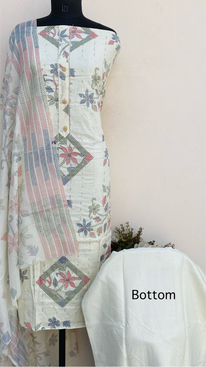 Designer Embroidered Suit Length 3 Piece Cream Mal Cotton With Sequence Work With Printed Mal Cotton Dupatta & Same Colour Cotton bottom