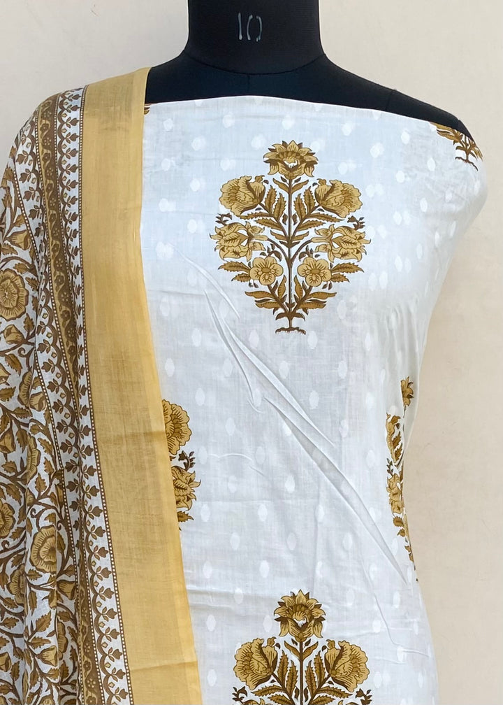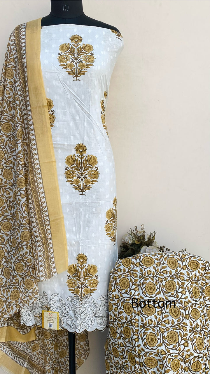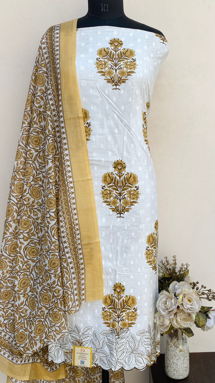 Designer Embroidered Suit Length 3 Piece Cream Mal Cotton With Sequence Work With Printed Mal Cotton Dupatta & Printed Same Colour Cotton bottom