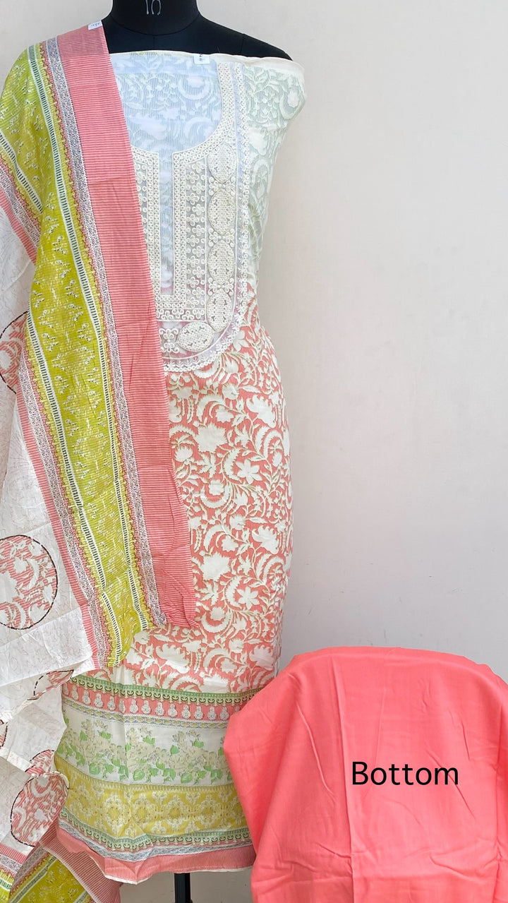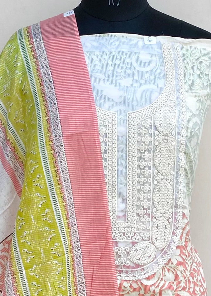 Designer Embroidered Suit Length 3 Piece Cream Mal Cotton With Sequence Work With Printed Mal Cotton Dupatta & Pink Colour Cotton Bottom
