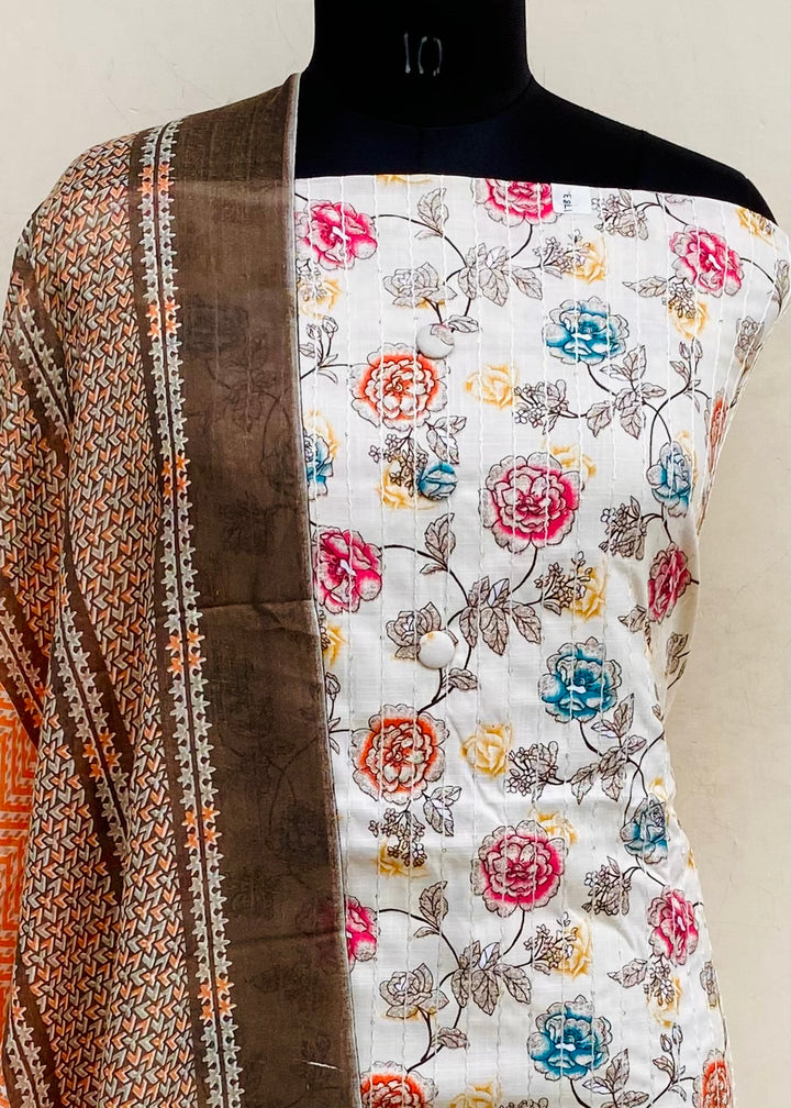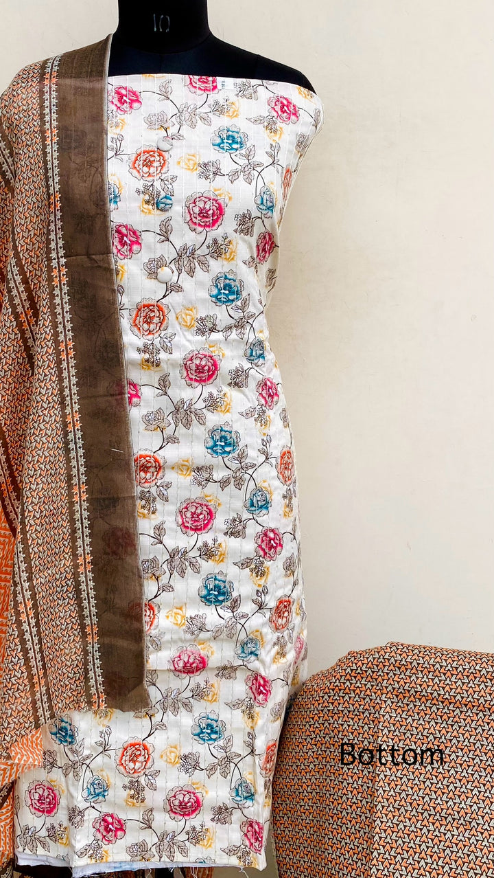 Designer Embroidered Suit Length 3 Piece Cream Mal Cotton With Sequence Work With Printed Mal Cotton Dupatta & Printed Orange Colour Cotton Bottom